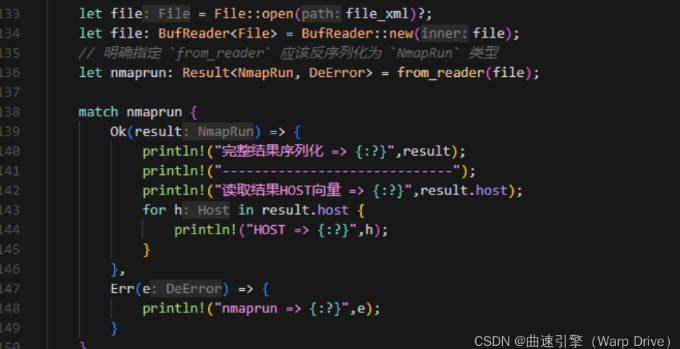 在设计结构体的时候需要注意元素和属性的区别,在 Rust 中,NmapRun 结构体是用来表示 XML 文件中 <nmaprun> 元素的数据模型。这个结构体使用了 serde 库来进行序列化和反序列化操作,即将 Rust 结构体实例转换回 XML 数据或者将 XML 数据转换为 Rust 结构体实例。